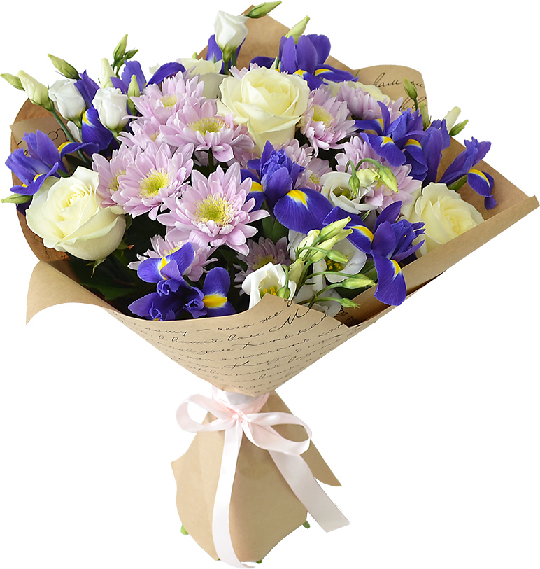 1 синий ирис, 2 белых розы, 1 розовая хризантема, 1 лизиантус, зелень, упаковка, лента5 синих ирисов, 2 белых роз, 2 розовых хризантем, 2 лизиантуса, зелень, упаковка, лента9 синих ирисов, 5 белых роз, 3 розовых хризантем, 4 лизиантуса, зелень, упаковка, лента
