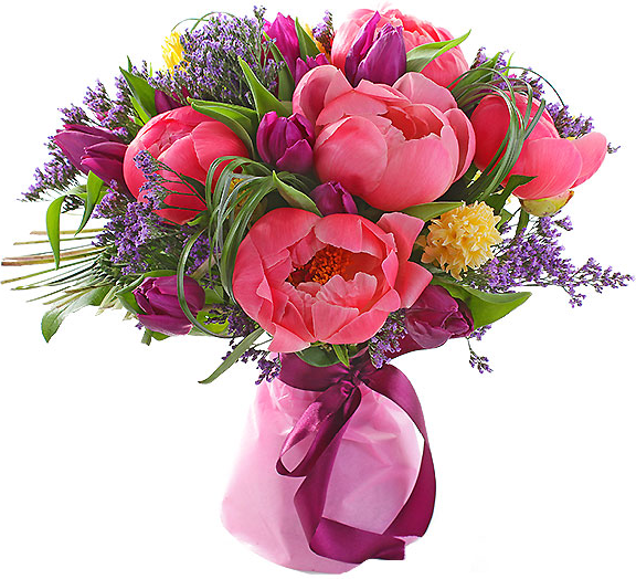 1 пион, 4 фиолетовых тюльпанов, лимониум, зелень, упаковка, лента3 коралловых пионов, 5 фиолетовых тюльпанов, лимониум, зелень, упаковка, лента5 коралловых пионов, 9 фиолетовых тюльпанов, лимониум, зелень, упаковка, лента